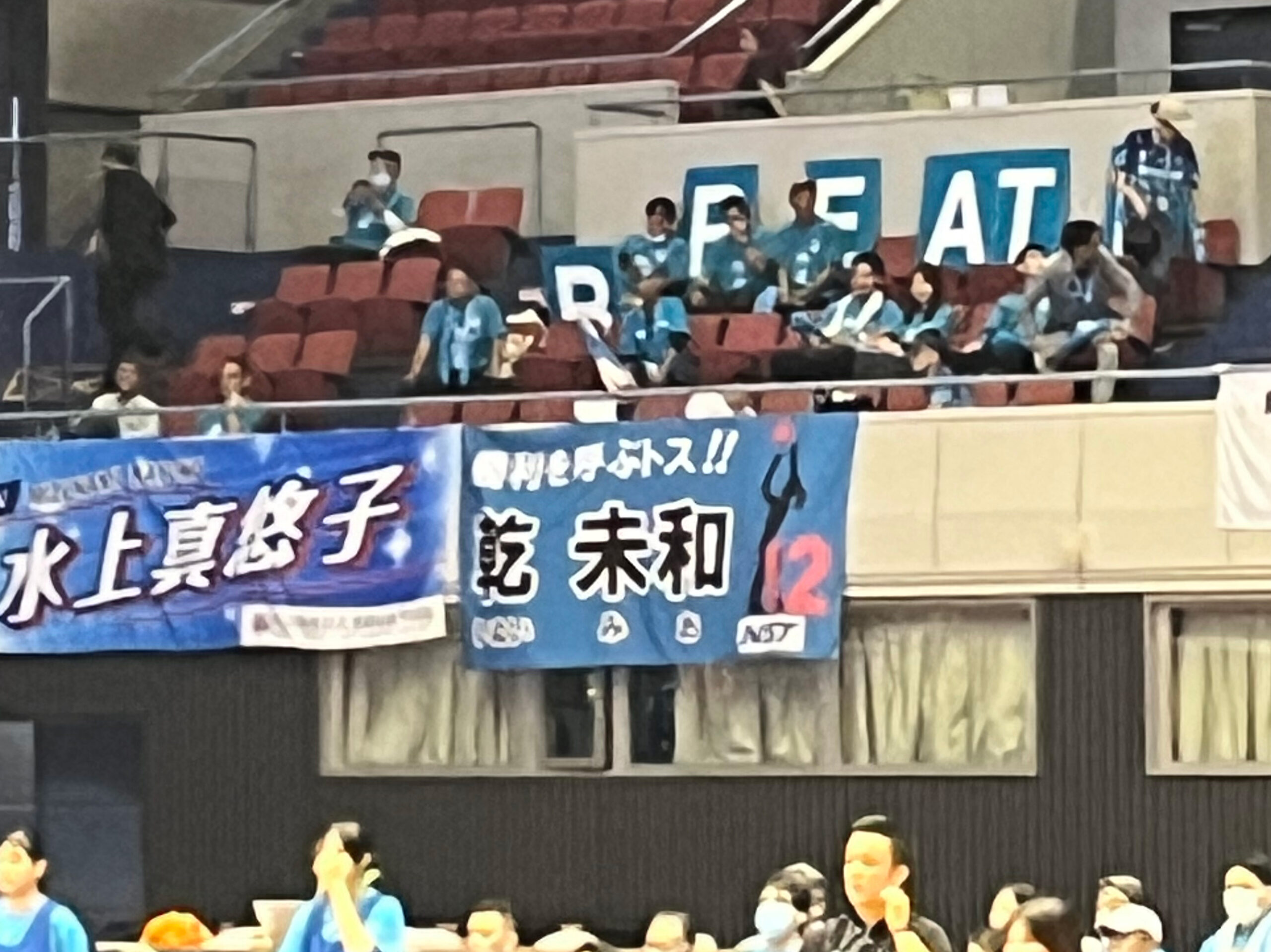 また、今年7月に当社へ入社したブレス浜松所属の乾 未和さん(いぬい みお:背番号12)を応援するため、NSTではオリジナル横断幕を制作しました。